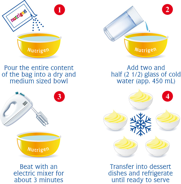 Instant, no cook easy to prepare fiber puddings. Pour the entire content of the bag into a dry and medium sized bowl and add two and half (2 1/2) glass of cold water (app. 450 mL) and beat with an electric mixer for about 3 minutes until a homogenous puddings is formed, than transfer into dessert dishes and refrigerate until ready to serve. Make a very easy and delicious dessert dishes with high fiber, micronutrient rich Nitrugen Banana Flavoured Instant Puddings and Pie Filling Powder