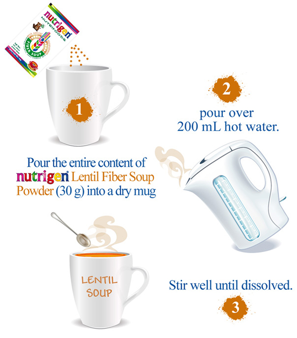 Instant Letil Fiber Soup. Pour the entire content of nutrigen Instant Lentil Fiber Soup Powder Mix (30g) into a dry mug and pour over 200 mL hot water. Stir well until dissolved. Once mixture is ready, consider your soup to be in consumable temperature. If mixture thickens add more water and stir.