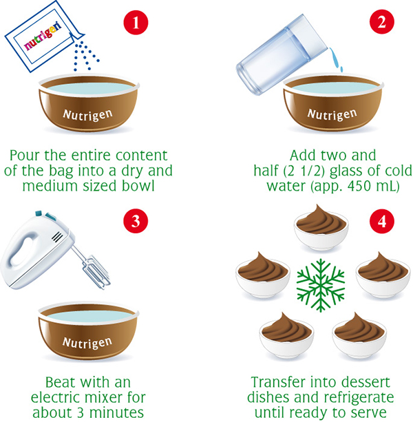 Vierte el contenido completo del sobre en un tazón de tamaño mediano y agrega dos vasos y medio de agua fría (aprox. 450ml) mezcla con una mezcladora eléctrica durante alrededor de 3 minutos hasta que la mezcla sea homogénea. Transfiere la mezcla a platos de postre y refrigera hasta que esté listo para servir. Prepara deliciosos postres, ricos en micronutrientes con Nutrigen Pudin Instantáneo con sabor a Chocolate.