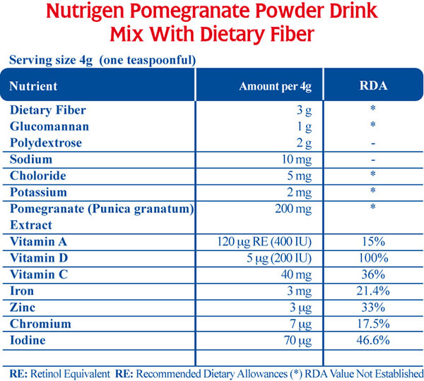 Nutrigen Bebida en Polvo sabor a Granada, contiene 3 gramos de fibra dietética de los cuales Glucomanano 1g y fibras solubles 2g por porción. Consumiendo entre 2 y 3 porciones diarias obtienes entre 6 y 9 gramos de fibra que es cerca de la mitad de la dosis diaria necesaria por niños entre los 5 y los 7 años de edad. El alto consumo de fibra dietética, actividad física regular y alimentos bajos en calorías, te protegen en contra del sobrepeso y el aumento de peso indeseado. Cambia el consumo de alimentos llenos de “calorías vacías” por alimentos “Nutritivos” para crear y mantener una buena salud.