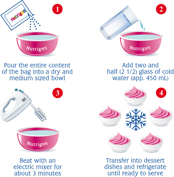 Vierte el contenido completo del sobre en un tazón de tamaño mediano y agrega dos vasos y medio de agua fría (aprox. 450ml) mezcla con una mezcladora eléctrica durante alrededor de 3 minutos hasta que la mezcla sea homogénea. Transfiere la mezcla a platos de postre y refrigera hasta que esté listo para servir. Prepara deliciosos postres, ricos en micronutrientes con Nutrigen Pudin Instantáneo con sabor a Fresa.